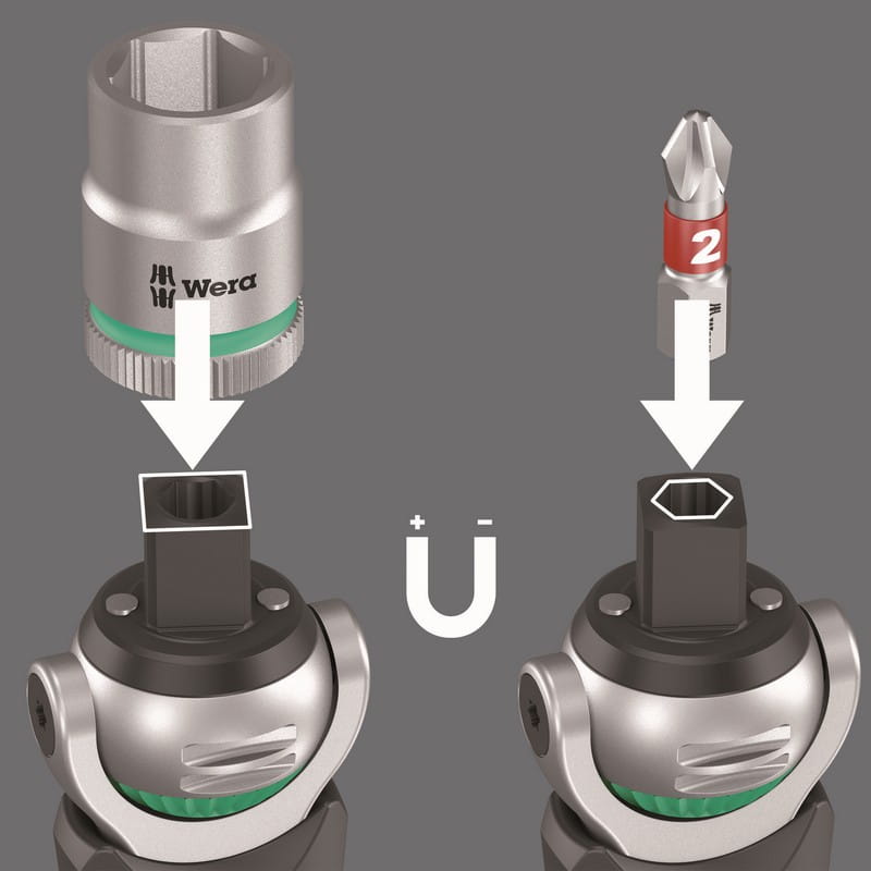 Magnetyczne mocowanie bezpośrednie umożliwia zastosowanie grzechotki 3/8" jako wkrętaka z grzechotką do bitów z uchwytem 1/4"