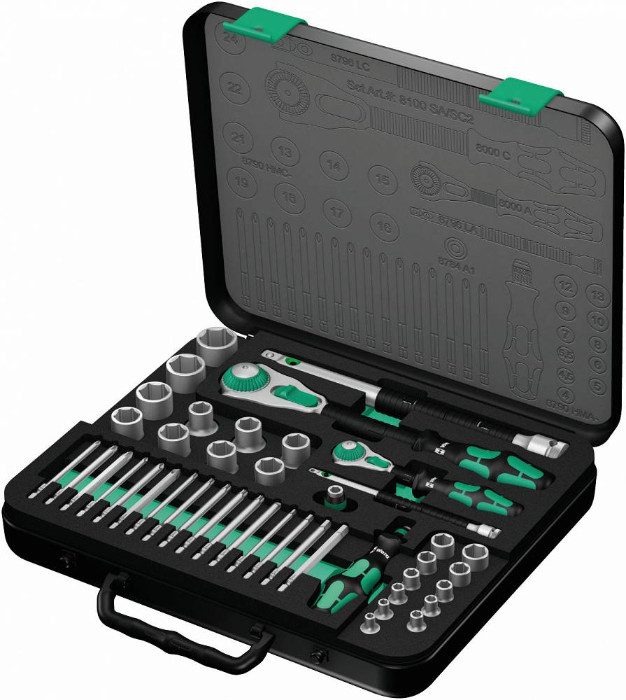Do kluczy nasadowych i adapterów z gniazdem czworokątnym 1/4”, z zatrzaskiem kulkowym. 21 kluczy nasadowych Zyklop, 2 przedłużacze Zyklop z tuleją obrotową, 1 rękojeść Kraftform z uchwytem do grotów i końcówek i uchwytem szybkomocującym 16 końcówek.
