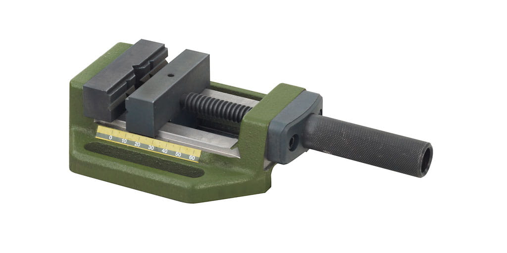 Podstawa ze specjalnego odlewu z prowadnicami CNC. Wymienne szczęki. Frezowana płaska powierzchnia. Wrzeciona z gwintami trapezowymi dla łatwego zazębiania się nawet przy dużym obciążeniu osi.
