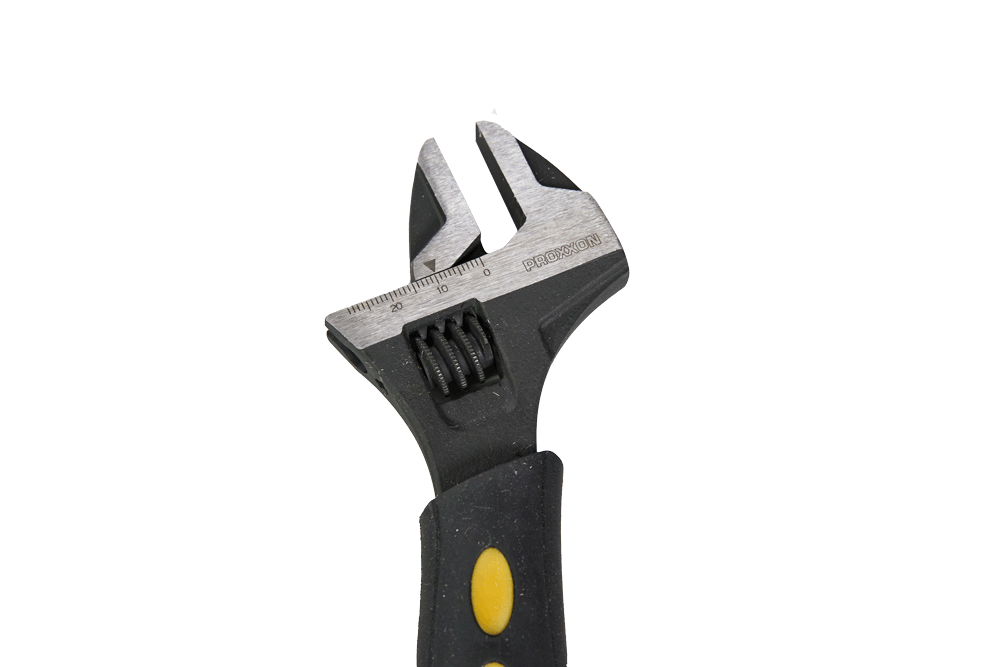 Wyjątkowo wydłużona wersja z przyjaznym dla skóry i ergonomicznym uchwytem wykonanym z odpornego na smary i kwasy termoplastycznego tworzywa (TPR) z otworem do zawieszania. Wąska głowica ze szlifowanymi szczękami. Precyzyjne prowadzenie ruchomego ramienia z łatwym ustawieniem za pomocą ślimaka narzędziowego. Czytelna skala milimetrowa ułatwia identyfikację rozmiaru klucza oraz pozwala na pomiar odkręcanej śruby.
