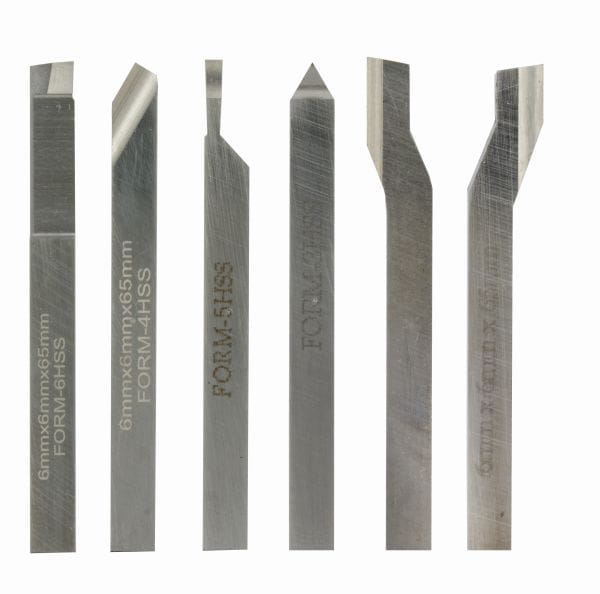 Z wysokogatunkowej, kobaltowej stali szybkotnącej. Oszlifowane, 6 części. Szeroki, zdzierak, przecinak, wykańczak, nóż lewy i nóż prawy (także do wykańczania powierzchni). Wielkość 6 x 6 x 65 mm. Do FD 150/E. Zestaw oferowany w drewnianej skrzynce.