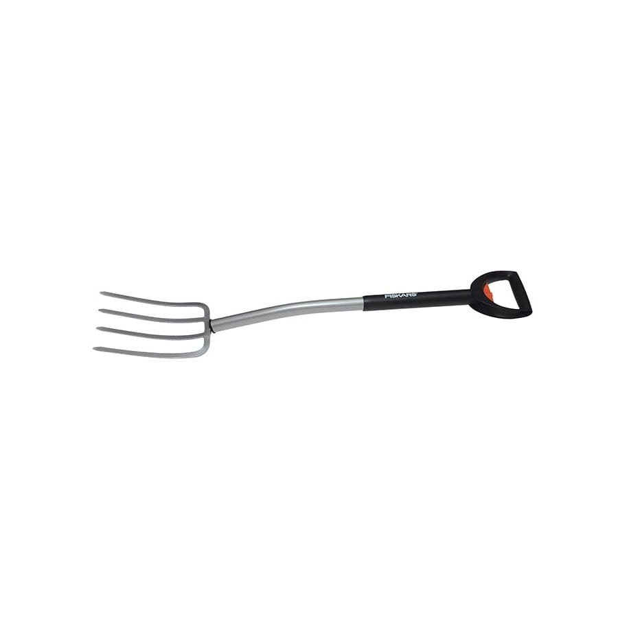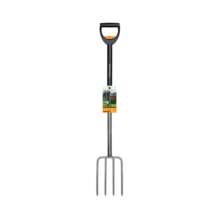 Fiskars to teleskopowe widły do kopania. Możliwość regulacji długości od 105 do 125 cm pozwala na wygodną pracę. Kąt nachylenia trzonka 13 stopni, głowica stalowa, ostre i mocne zęby ułatwiają kopanie w ciężkiej glebie.