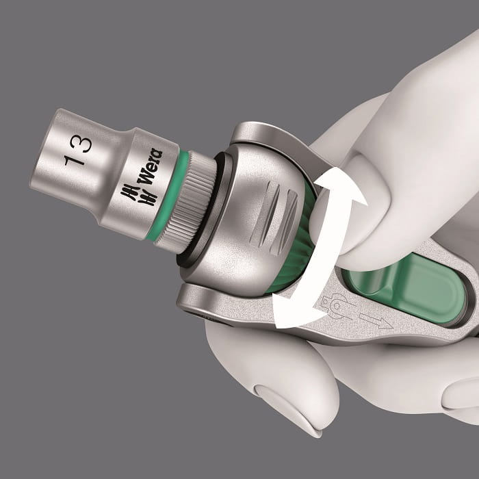 Wychylna główka grzechotki, wyzwolenie za pomocą przycisku i przełącznik zmiany kierunku pracy