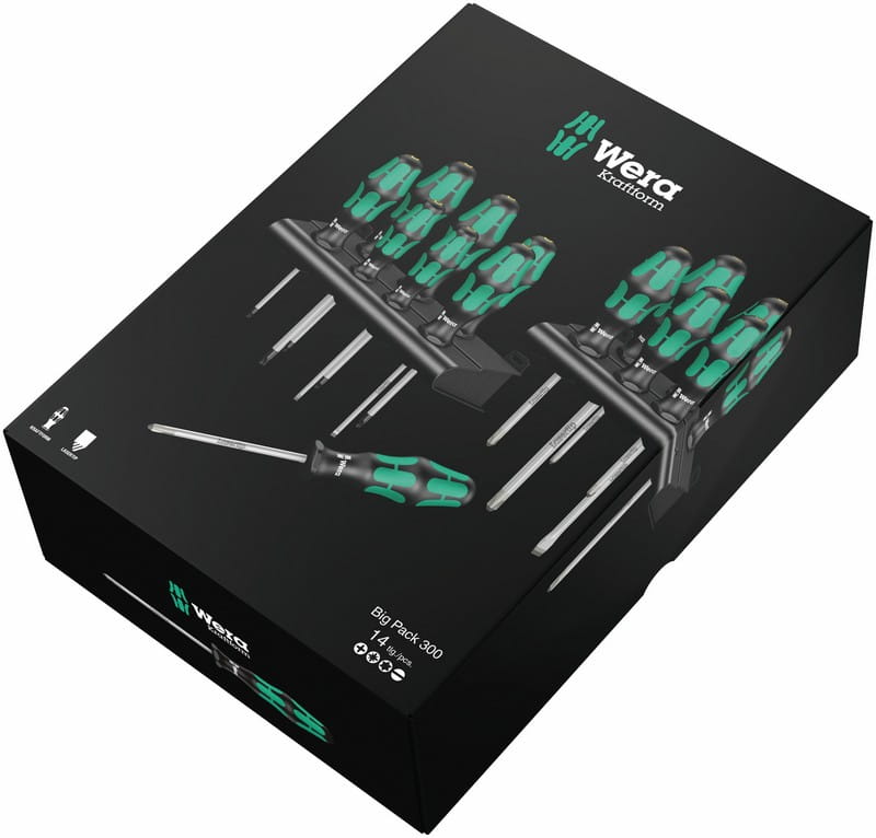 Kraftform Big Pack 300Końcówka Lasertip zapobiega wyślizgiwaniu się wkrętówLasertipZredukowana siła naciskuDopasowane do dłoniSzybkie obracanie rękojeści w dłoniSystem wyszukiwania Take it easyZabezpieczenie przed staczaniem