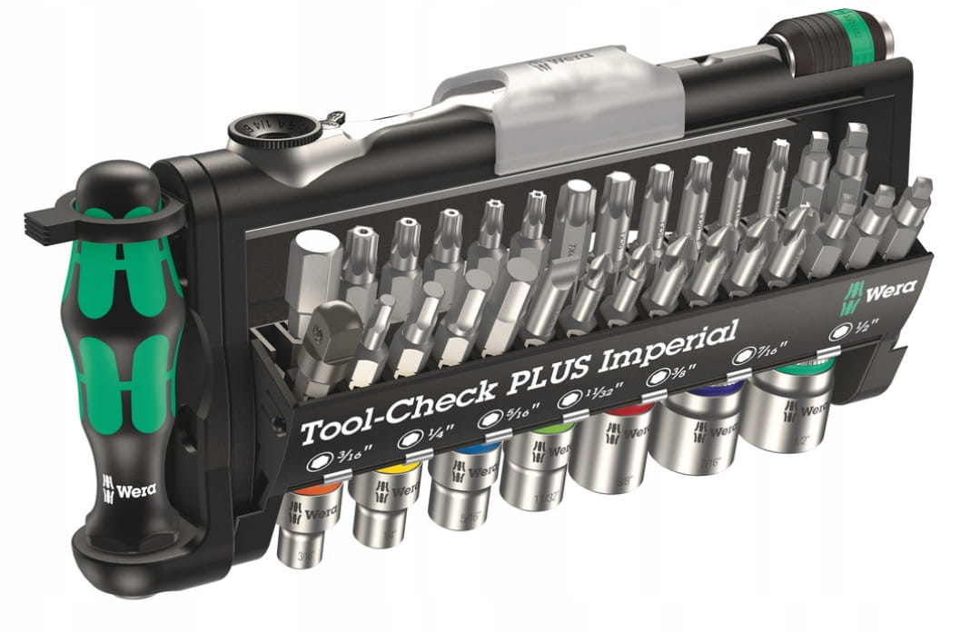 Zestaw złożony z grzechotki, bitów, kluczy nasadowych i rękojeści z uchwytem w niewielkiej przestrzeni. Idealny do różnorodnych