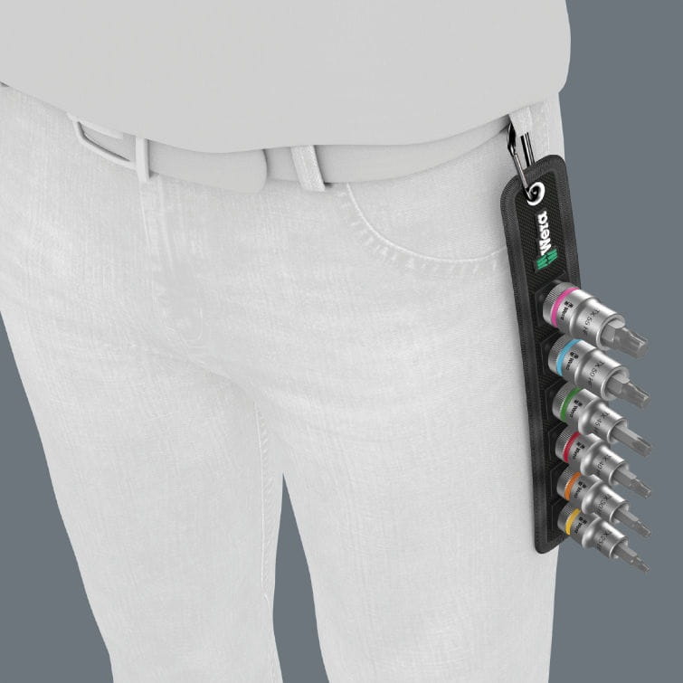 Wytrzymała zawieszka tekstylna wykonana w stylu charakterystycznym dla firmy Wera z 6 bitami nasadowymi i narzędziem do usuwania nakrętek do pracy w ograniczonych przestrzeniach.