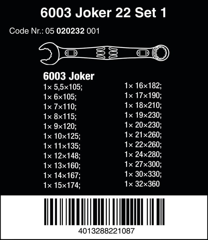 ZESTAW KLUCZY PŁASKO-OCZKOWYCH 6003 JOKER 22 SET 1, 22SZT. WERA W05020232001