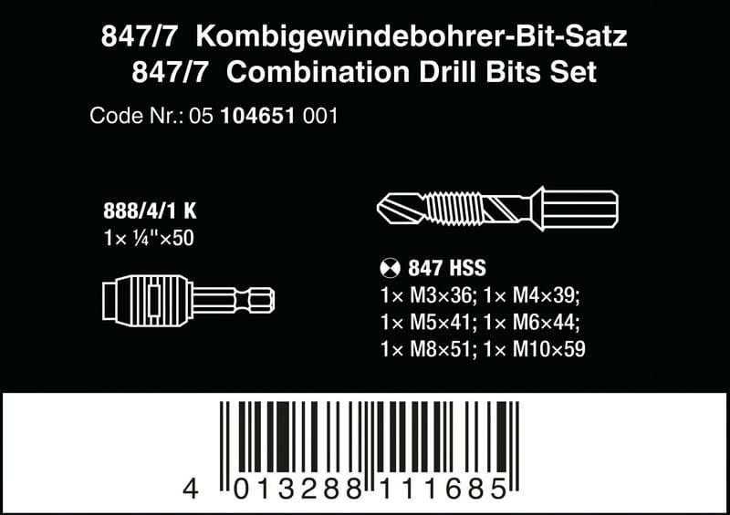 ZESTAW WIERTEŁ-GWINTOWNIKÓW Z CHWYTEM SZEŚCIOKĄTNYM, 7CZ. WERA W05104651001