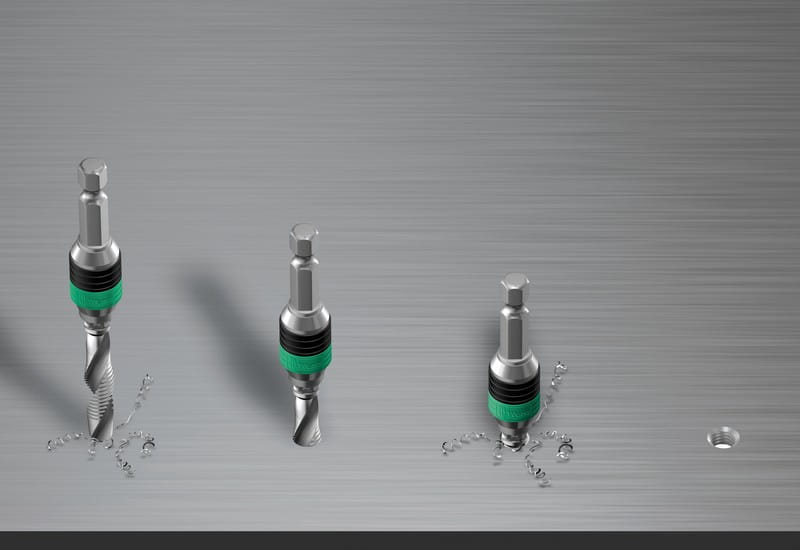 Z uchwytem uniwersalnym Rapidaptor i gwintownikami z wiertłem z chwytem sześciokątnym 1/4"