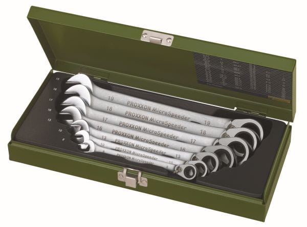 Zestaw profesjonalnych narzędzi PROXXON MicroSpeeder. Klucze od 8 – 19 mm. W skład zestawu wchodzi po sztuce SW: 8 – 10 – 13 – 16 – 17 – 18 oraz 19. Pakowane w stabilnej skrzynce metalowej.