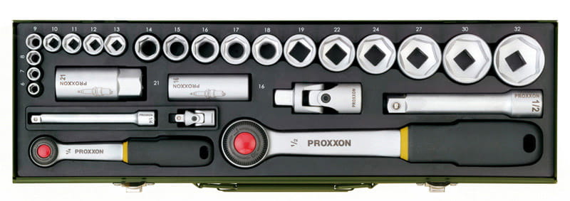 Profesjonalny zestaw kluczy nasadowych PROXXON z grzechotkami 1/2" i 1/4". Zestaw składa się z 27-elementów. Dla wszystkich typowych śrub w samochodach - nasadki 6 – 32 mm, nasadki do świec 16 i 21 mm. Pozostałe elementy widoczne na zdjęciu.