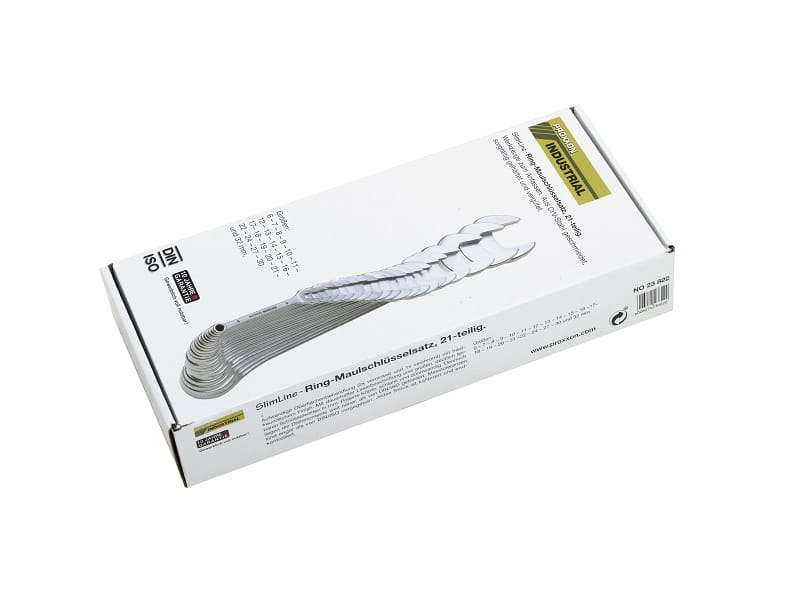 Zestaw profesjonalnych kluczy płasko-oczkowych PROXXON SlimLine. Wykonany zgodnie z nor mmi DIN 3110 oraz ISO 3318.