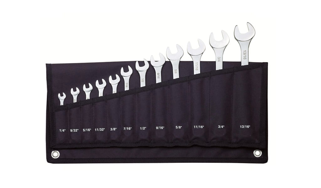 Zestaw kluczy płasko-oczkowych calowych – 12 szt. W praktycznej zwijanej rolce płóciennej i otworami do wieszania.