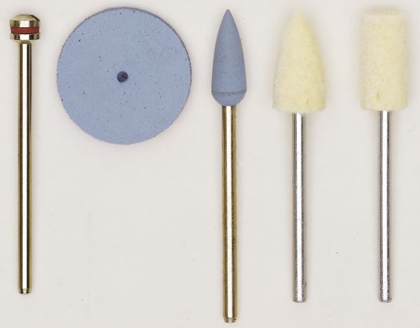 • Zawiera po jednej sztuce końcówek polerskich (cylinder, stożek, koło), końcówek silikonowych (łuska, cylinder, koło), tarczę bawełnianą, wełnianą i zamszową oraz pastę polerską.