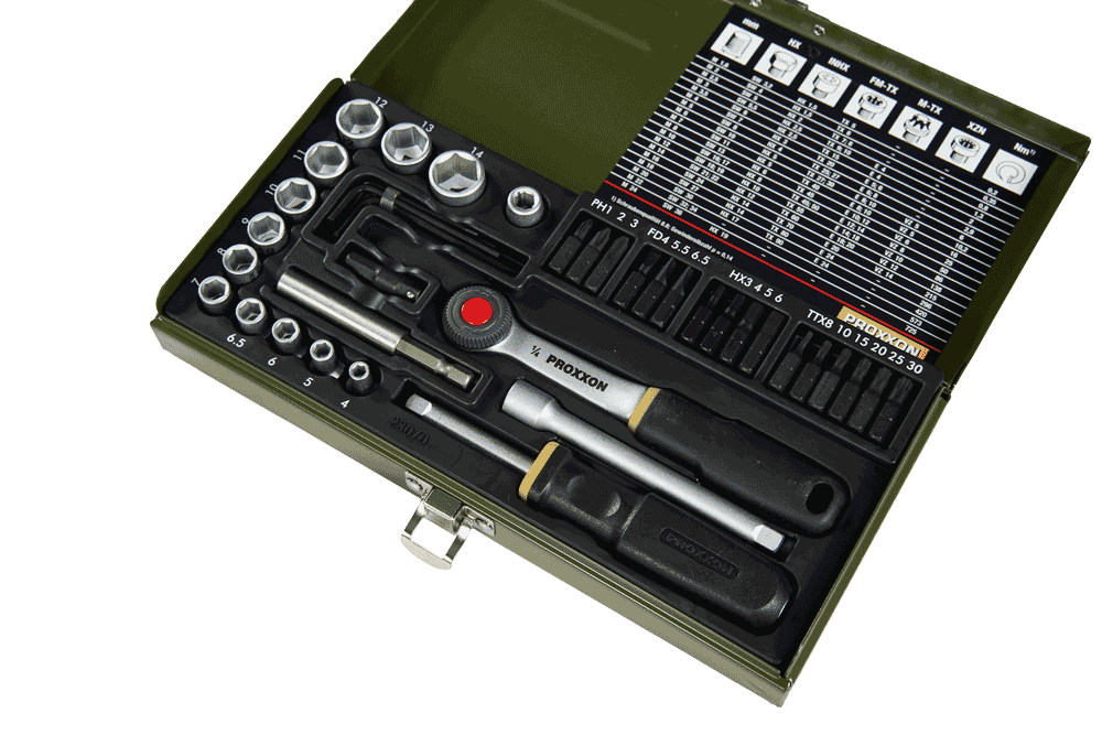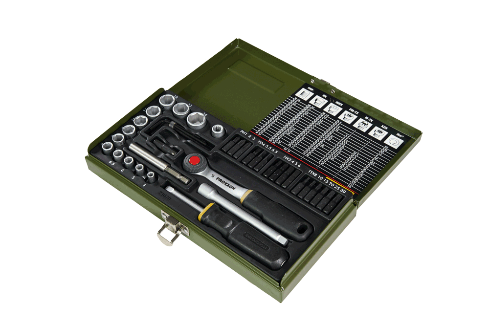 39-elementowy zestaw profesjonanych wkrętaków PROXXON z uchwytem magnetycznym. Zawiera nasadki (1/4"= 6,3 mm) w rozmiarach 4 – 14 mm, dodatkowo 16 bitów ze stali specjalnej, 1 adapter do połączenia sześciokąt/czworokąt (uchwyt magnetyczny/nasadka) i 1 adapter (inbus/czworokąt) do połączeń grzechotka/bit. Wygięte klucze imbusowe 1,25 – 1,5 – 2 – 2,5 i 3 mm. Pozostałe elementy widoczne na zdjęciu.